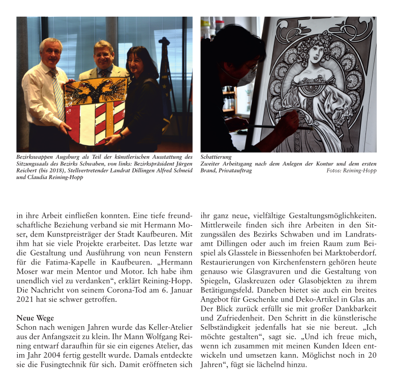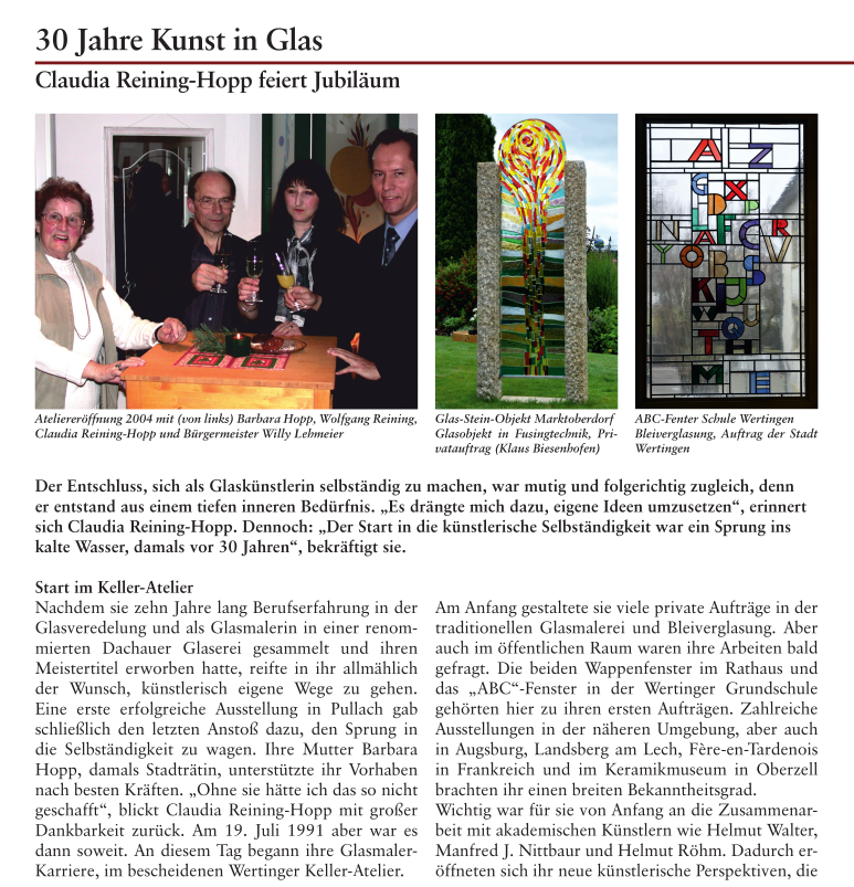 Claudia Reining-Hopp fällt etwas aus dem Rahmen. Ihr Medium ist Glas und hat einen ganz anderen Charakter, als Öl und Pastellkreide. Auch Claudia Reining-Hopp, ebenfalls in Wertingen geboren und aufgewachsen, versucht, andere Blickwinkel hervorzuheben mit Ansichten, die man so nicht auf den ersten Blick sieht. Sie beschäftigt sich gern mit Zyklen, mit Menschen und Emotionen und ein bisschen Mystik darf auch dabei sein... Alle drei Künstler verbindet eine Affinität zur Natur, der in ihre Bilder einfließt.